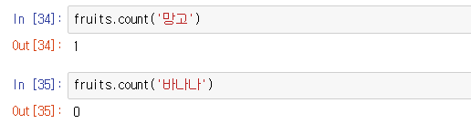 fruits 라는 리스트가 있을 때 그 안에 망고라는 항목이 몇개나 있는지 확인하기 위해서는 fruits.count( '망고' )라고 입력하면 된다.
