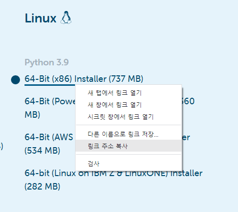 내 컴퓨터가 아닌 EC2 리눅스에 아나콘다를 설치하는 것이기 때문에, 아나콘다 다운로드 홈페이지로 가서 파이썬 파일의 링크 주소 복사를 해준다.