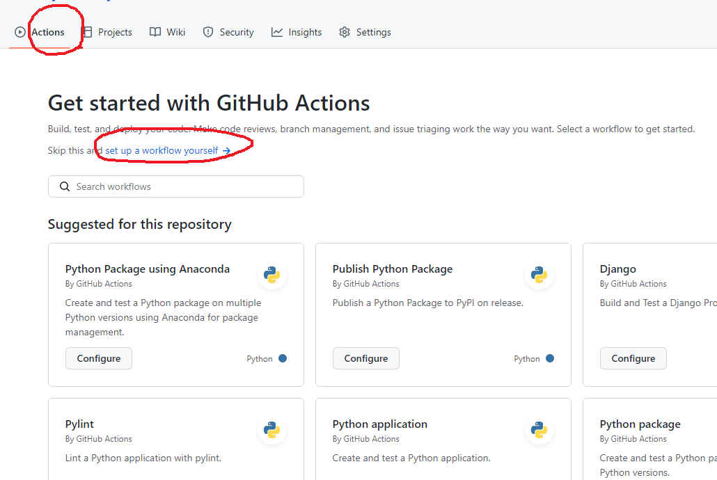 설정이 완료되었으면, Actions - set up a workflow yourself 를 클릭한다.