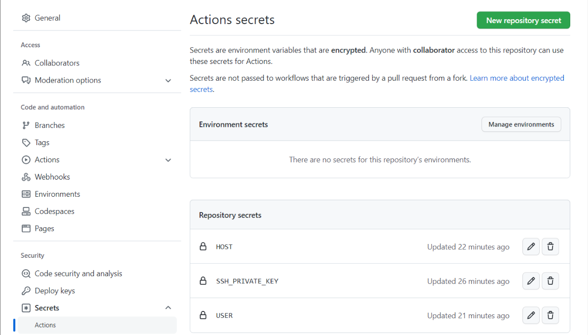 setting - 사이드바의 secrets - actions 를 클릭하여서 SSH_PRIVATE_KEY, USER, HOST 키를 설정해주어야 한다.