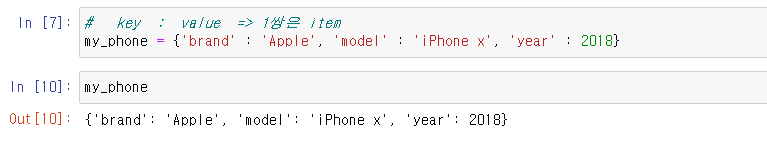 아래의 딕셔너리(dict)에서 key값은 brand, model, year이고 value는 apple, iPhone x, 2018이 해당된다.