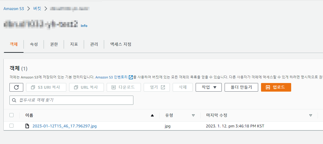 AWS 의 S3 로 이동하여, 맨 처음에 생성한 버킷으로 이동해보면 위에서 실행한 jpg 파일이 업로드 되어있는 것을 확인할 수 있다.