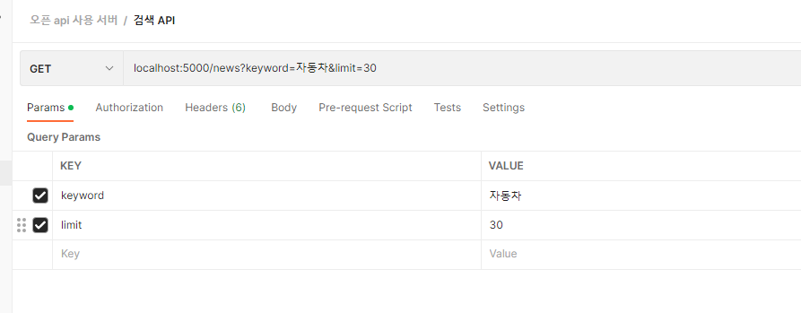 - 포스트맨에서 Query Parms - KEY 값에 검색할 데이터와 가져올 데이터 수를 지정하였다.