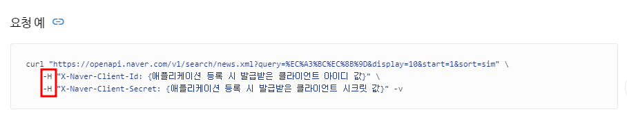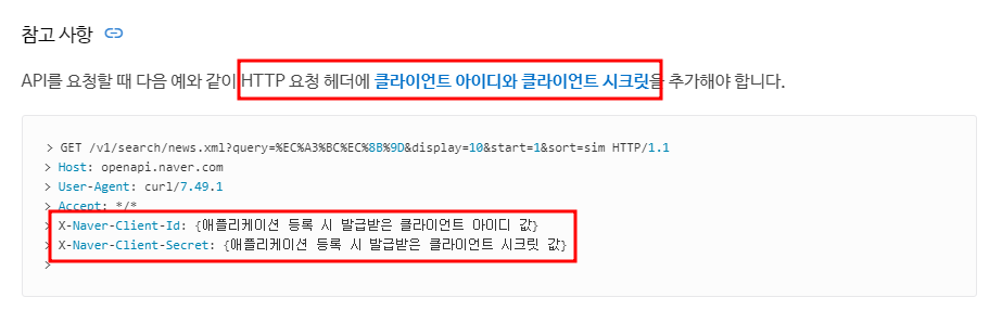 헤더에 넣어야 하는 값은 Client-id 값과 Client-Secret 값이다.