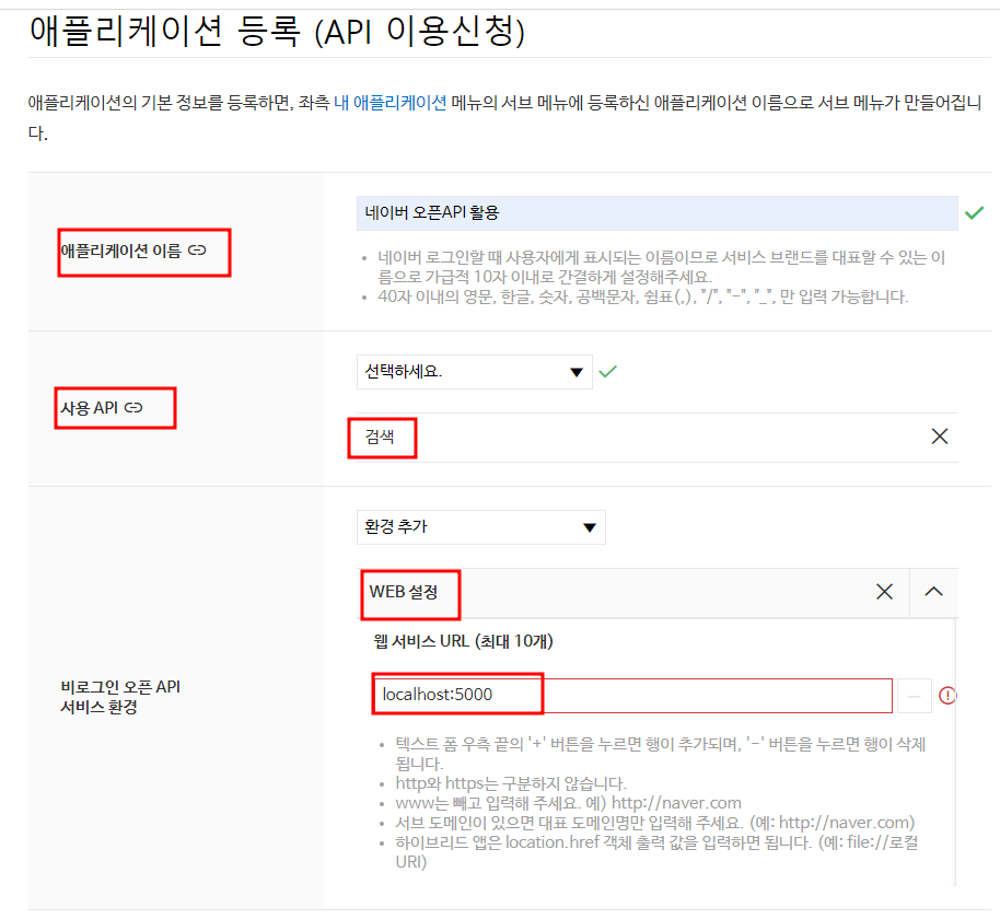 애플리케이션 등록 (API) 이용 신청은 아래처럼 하였다.