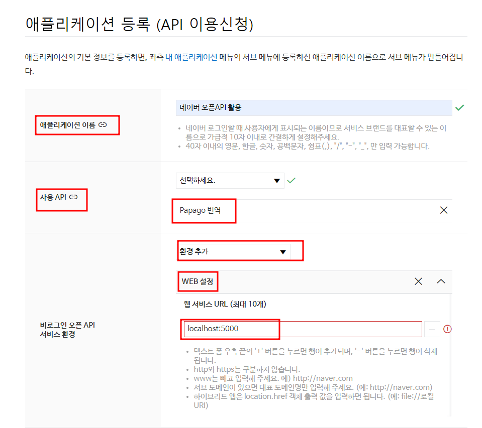 애플리케이션 등록 (API) 이용 신청은 아래처럼 하였다.