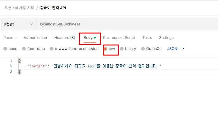 - 포스트맨에서 Body - raw - json 으로 설정하여서 작성한 데이터를 번역할 것이다.