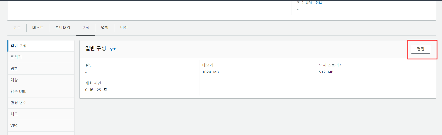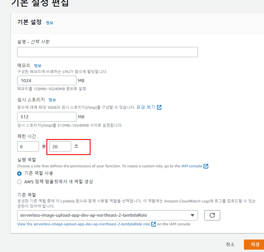 1. aws lambda 로 접속하여서 제한시간을 늘리는 방법