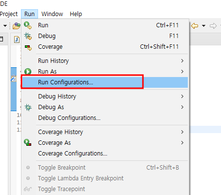 1. 상단바에서 Run - Run Configurations 로 이동한다.
