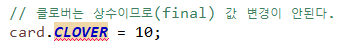 - 정석 사용법은 객체 생성없이 클래스(인터페이스)의 이름.상수명 이다.