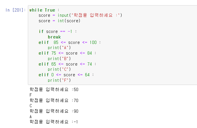 무한으로 학점을 입력 받을 때, 그에 맞는 결과 값을 리턴하고 -1 을 입력하면 loop를 빠져나온다.