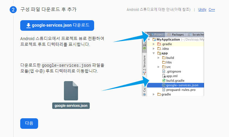 3. 구글 서비스 플로그인에서 제공하는 json 파일 다운로드 후 안드로이드 프로젝트에 추가한다.