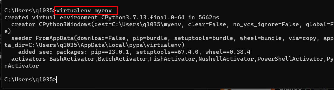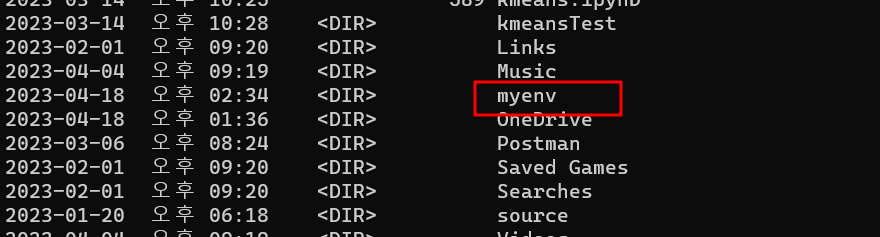 이후 cmd 에 dir를 입력해보면 내가 만든 가상환경이 있을 것이다.