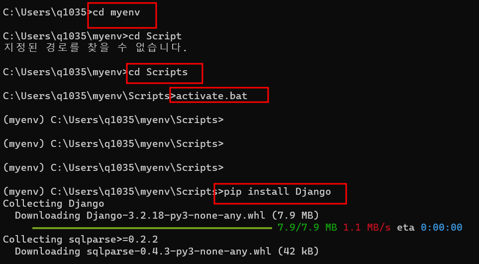 3. myenv안에 장고를 설치하기 위하여 디렉토리를 이동해주어야 한다.