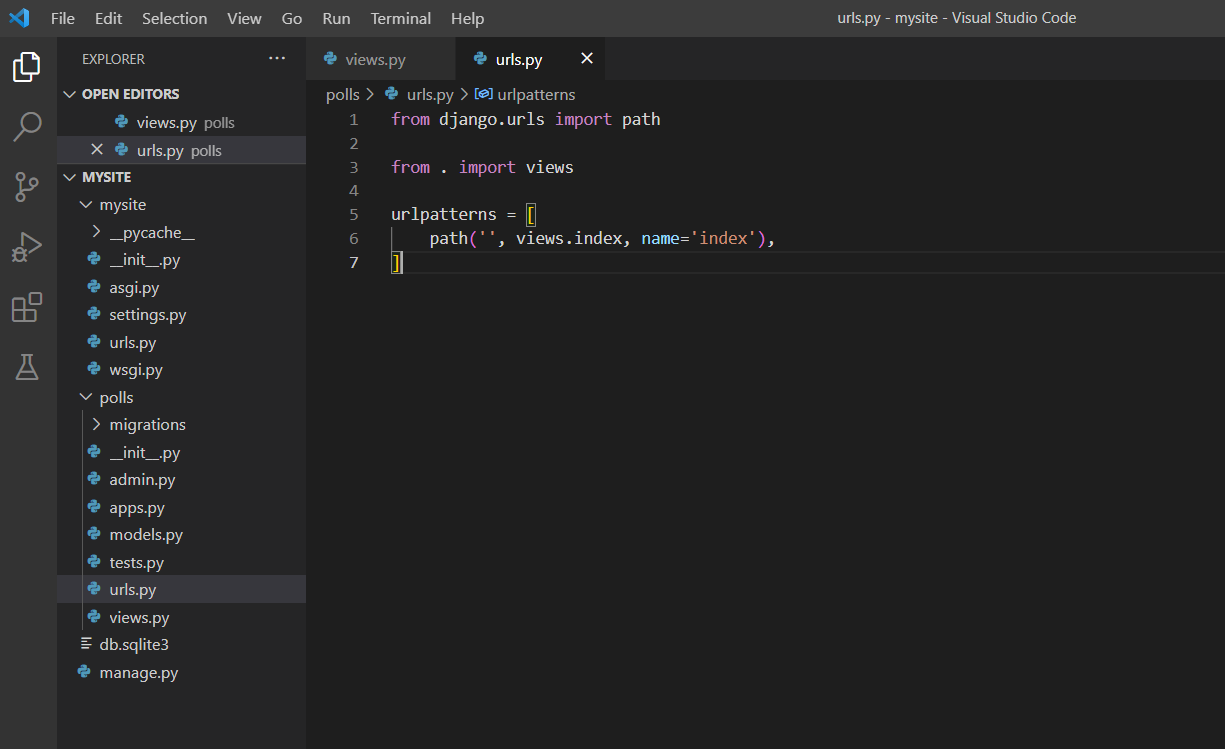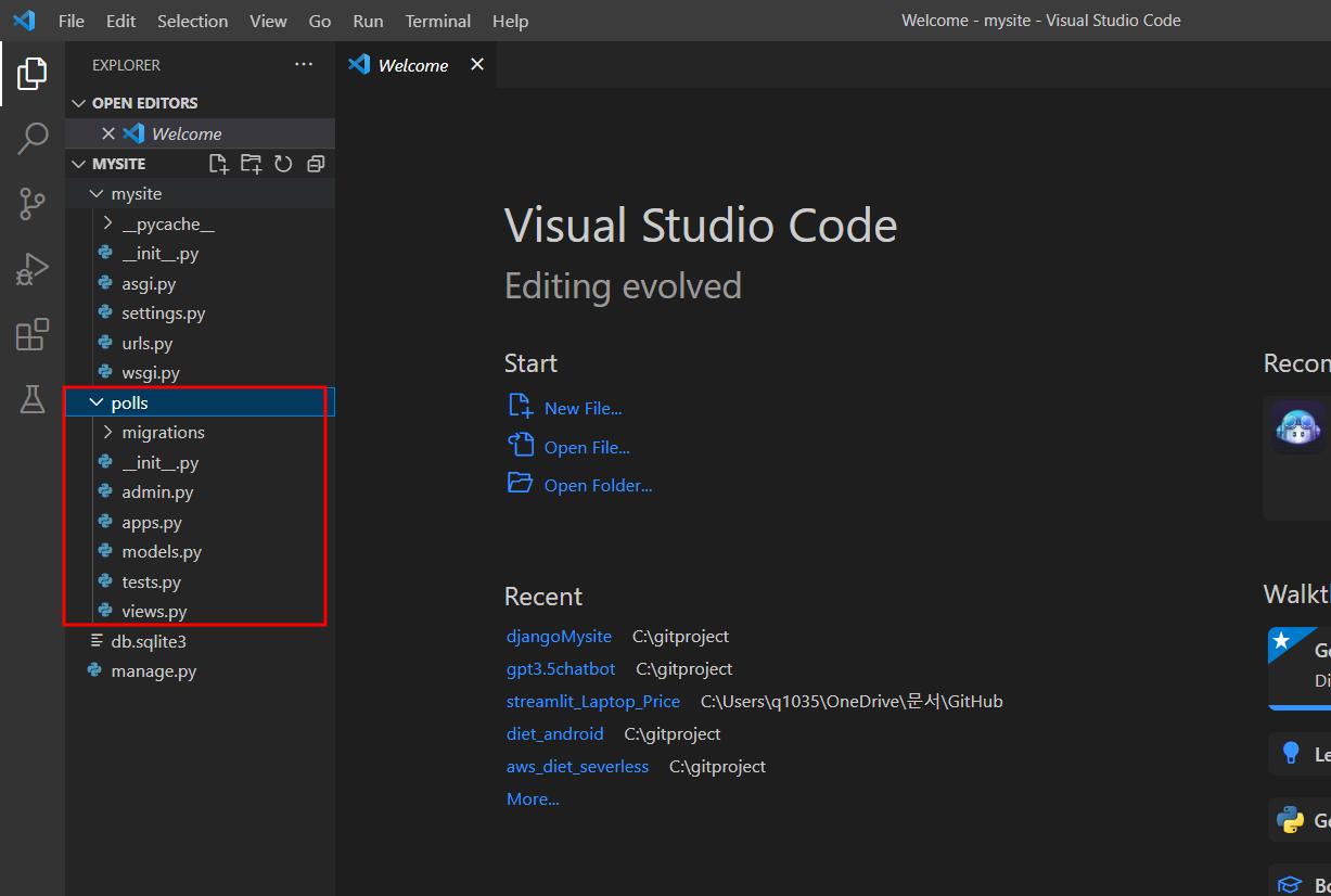 vs code를 확인해보면 polls라는 앱이 생성된 것을 확인할 수 있다.