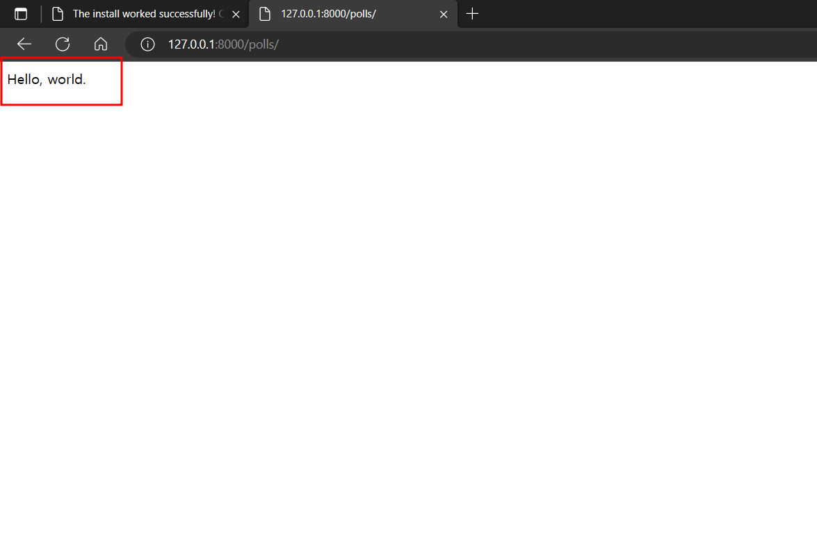 그 후 다시 서버를 구동하여 url에 내가 설정한 path인 polls/를 입력하면 아래와같은 결과값이 도출된다.