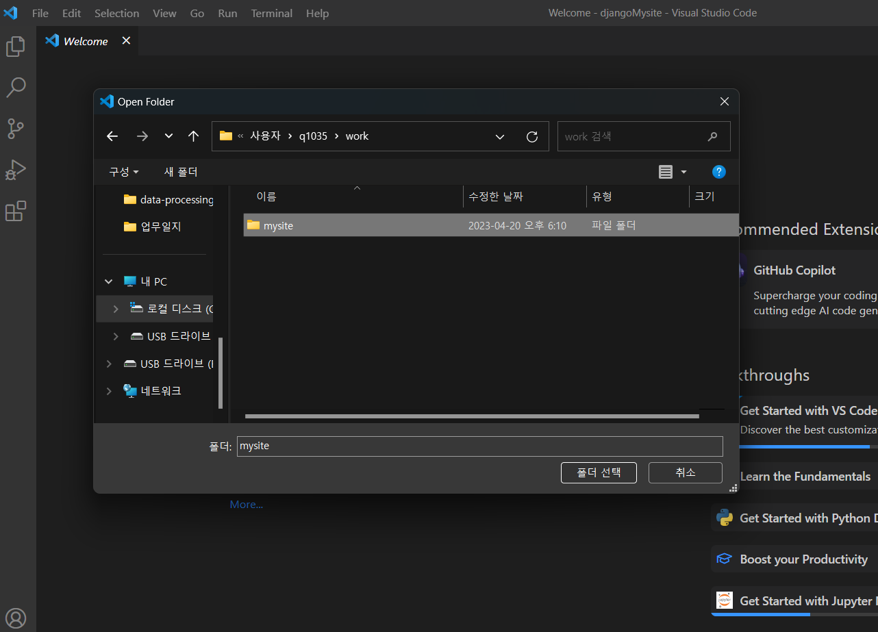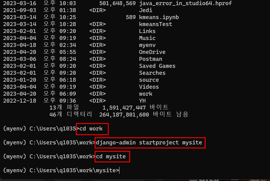 work 디렉토리로 이동하여서 mysite라는 장고 프로젝트를 생성을 하였다.