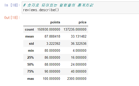 데이터프레임에서 숫자로 되어있는 컬럼들의 통계치값을 출력하는 방법은 describe( ) 함수를 이용하면 된다.