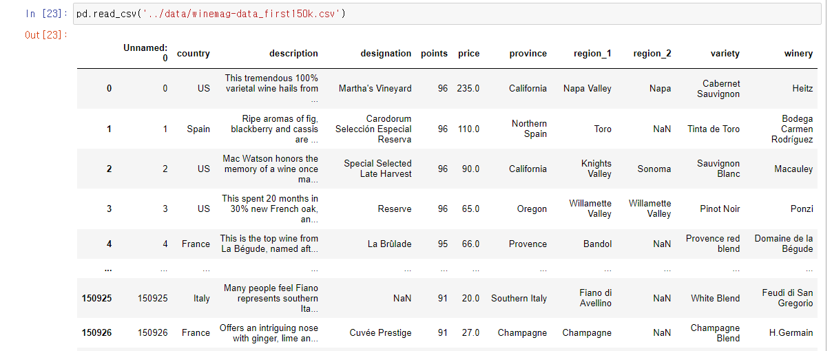 아래처럼 winemag-data_first150k.csv 파일을 불러오기 위해서는 pd.read_csv 파일을 이용하여야한다