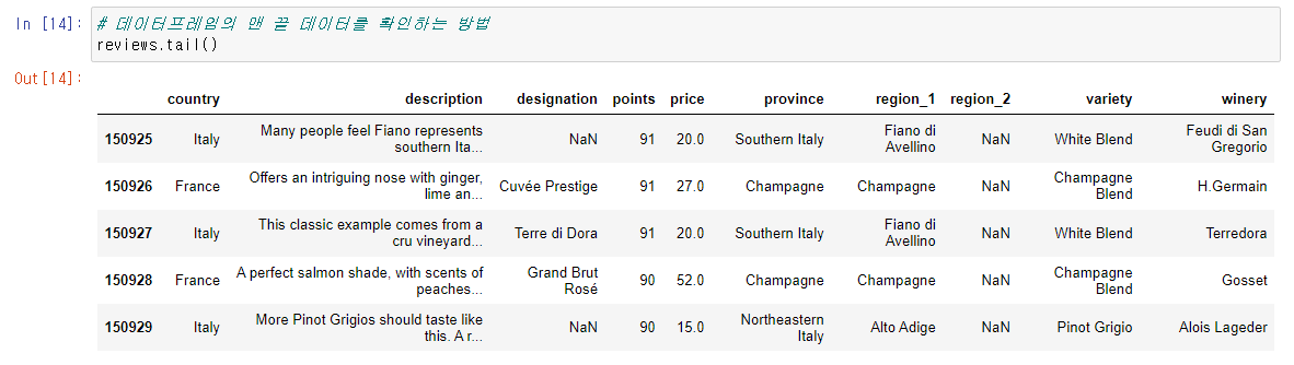tail( )함수를 이용하면 하위 데이터를 다섯개만 가져와서 출력해준다.