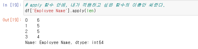 df['Employee Name'].apply(len) 으로 적으면 이름의 문자 갯수를 각 열별로 리턴해준다.