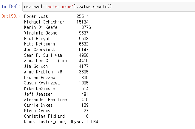 아래의 예시처럼 'taster_name' 컬럼의 고유한 값들의 데이터를 출력해준다.