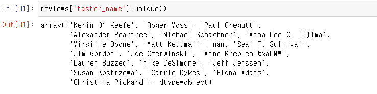 아래와같은 데이터프레임이 있을 때 'taster_name' 이라는 컬럼의 고유한 값들을 출력한 결과이다