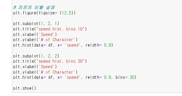 히스토그램에서 bins의 갯수는 기본 10로 출력이 되고, bins 갯수를 지정하고자 한다면 bins 파라미터에 원하는 갯수를 입력해준다.