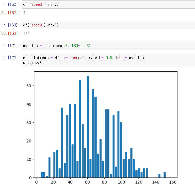 그 후 plt.hist() bins 파라미터에 저장한 변수를 넣어주면 된다.