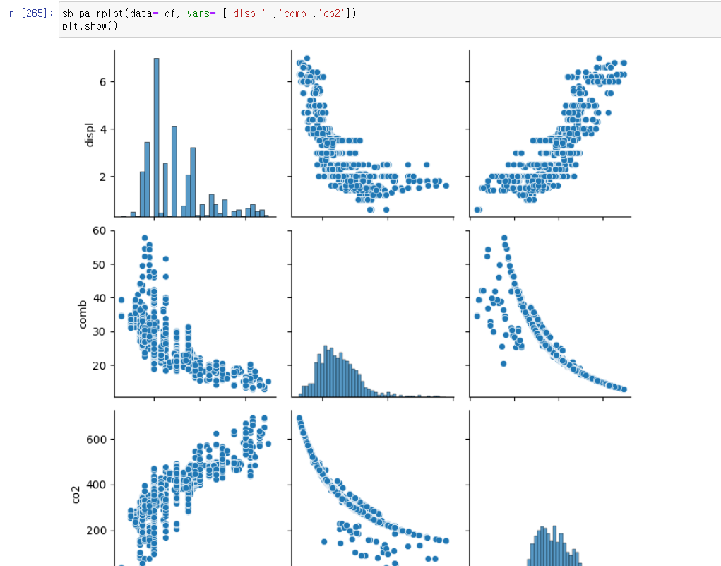 sb.pairplot() 으로 작성을 하고 괄호 안에는 data에 비교하고자 하는 컬럼이 표함된 데이터프레임명, vars에는 비교하고자 하는 컬럼들을 리스트 형식으로 작성해주면 된다.