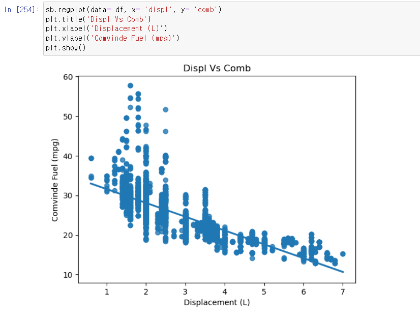 차트를 리턴받고자 할 때는, sb.regplot() 으로 작성을 하고 괄호안에는 scatter 차트 호출과 동일한 방식으로 data에는 데이터프레임명, x에는 비교하고자하는 첫번째 컬럼명, y에는 비교하고자 하는 두번째 컬럼명을 넣어주면 된다.