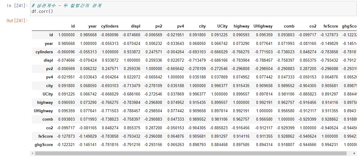 만약 원하는 컬럼들의 상관계수만 출력하고자 한다면, df[['displ','comb']].corr() 와 같이 리스트 형식으로 corr() 함수를 이용하면 된다.