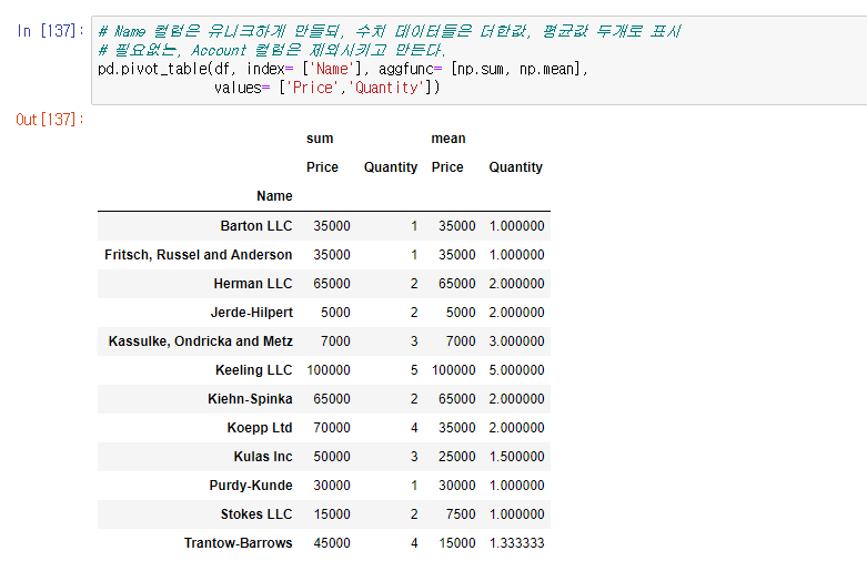 그리고 수치 데이터들의 합과 평균값 두가지를 나타내고 싶다면 aggfunc 파라미터에 넘파이형식으로 두가지의 계산을 넣어주면 된다.