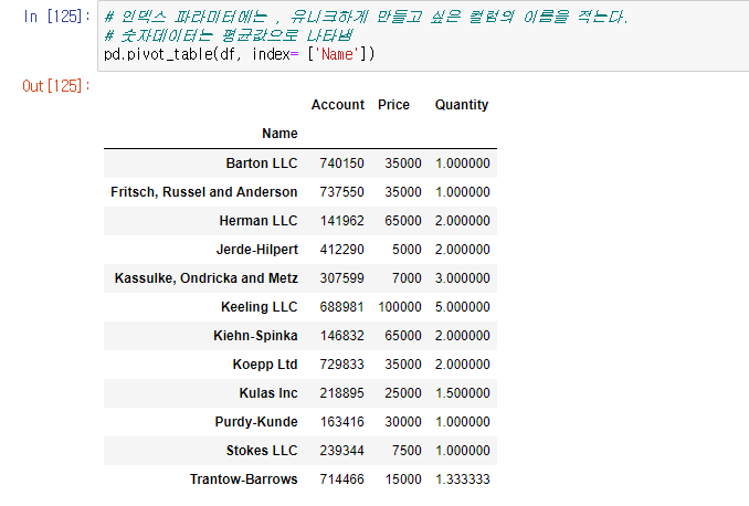 pd.pivot_table() 을 이용하여서 동일한 컬럼명의 수치 데이터들을 합치는 결과를 리턴할 수 있다.