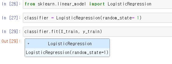 메모리에 LogisticRegression 를 올려주기 위해서 변수 classifier 에 저장을 해준다. 여기서 random_state 는 seed 값이다.
