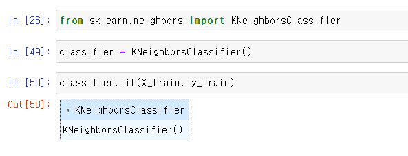 변수 classifier 에 KNeighborsClassifier() 을 저장해준 후 fit() 함수를 이용하여 인공지능을 학습시켜준다.