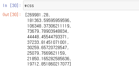 wcss 리스트에는 아래의 값들이 담겼다.