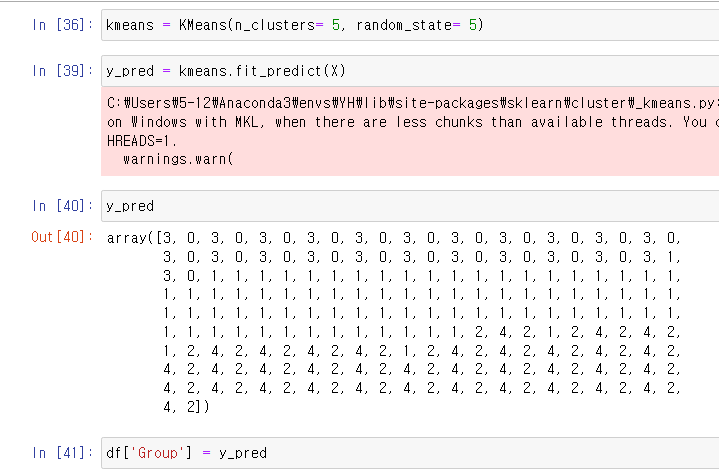 kmeans 로 X 의 값을 예측하도록 하고 변수 y_pred 저장을 한 후 확인을 해보면 아래와같은 결과가 나온다.