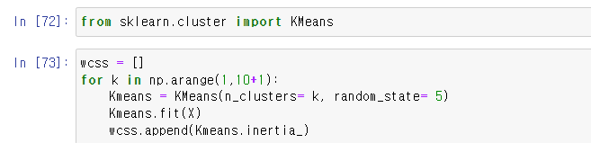 가장 적합한 기준점을 찾기 위해 wcss 라는 리스트를 만들고, 반복문을 이용하여서 인공지능 Kmeans 에 훈련한 값들을 wcss 리스트에 넣어줄 것이다.