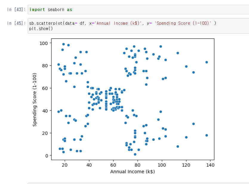 수입과 지출 데이터가 들어있는'Annual Income (k$)' 과 'Spending Score (1-100)' 컬럼을 변수 X 로 두었다.
