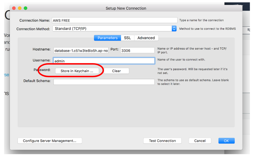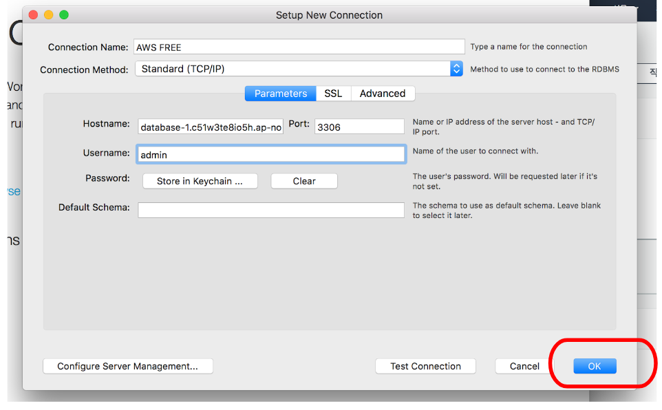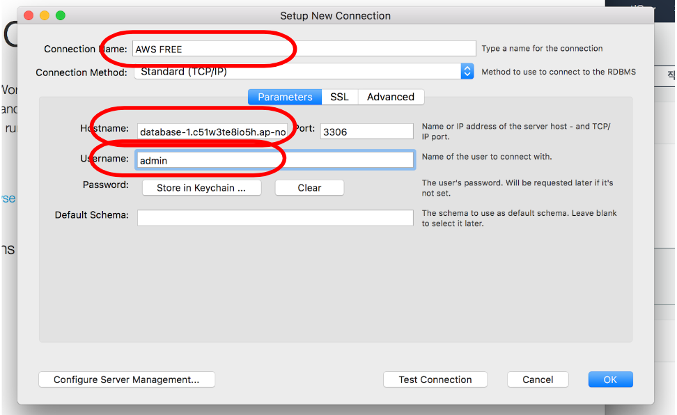 아래 connection name 에 sql 이름을 설정해주고, hostname 에는 RDS에서 준 엔드포인트를 입력해준다.