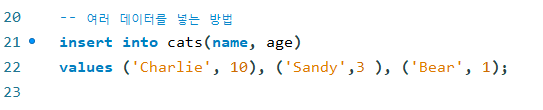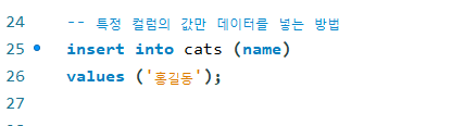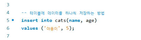 아래의 예시에서는 cats 라는 테이블 명에 name 컬럼에는 '야옹이', age 컬럼에는 5 라는 데이터를 저장하기 위해 insert into cats(name, age)