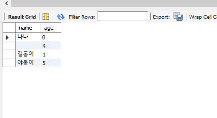컬럼 name 또는 age 에 빈 데이터를 넣었을 경우 아래처럼 자동으로 name 컬럼에는 야옹이, age 컬럼에는 int 형 1 데이터가 채워진 것을 볼 수 있다.