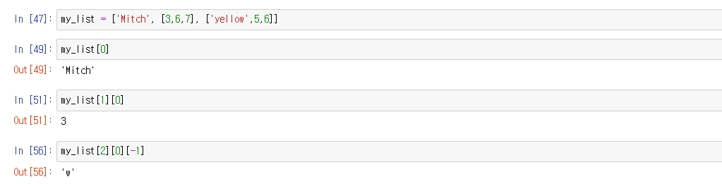 my_list에서 3 이라는 값을 가져오려면, my_list[1] 을 먼저 가져오면, [ 3, 6, 7 ] 이 되고,