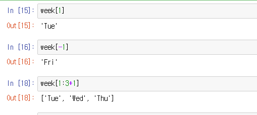week[ 4 ] = 'Fri', week[ -1 ] = 'Fri'로 두개의 값은 서로 같은 결과를 나타낸다.