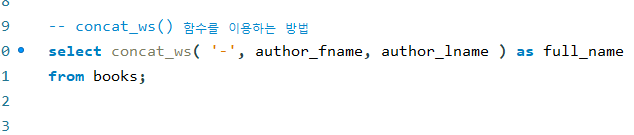 concat_ws () 함수는 둘 이상의 문자열이나 둘 이상의 컬럼 값에 구분자를 넣고 순서대로 합쳐서 반환해주는 함수이다.