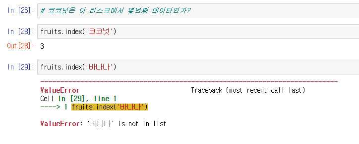아래에서 코코넛의 인덱스 위치를 찾으려 한다면 fruits 리스트의 index 함수에 코코넛을 넣어주면 된다.