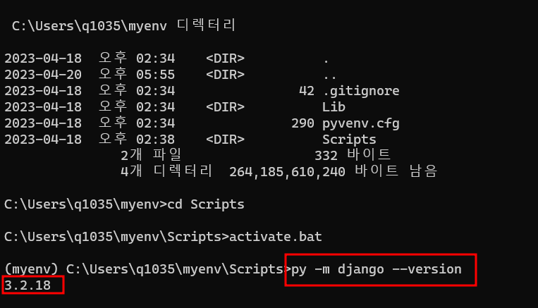 코드를 작성하면서 참고한 사이트이다. https://docs.djangoproject.com/en/2.2/intro/tutorial01/ Django The web framework for perfectionists with deadlines. docs.djangoproject.com 아직 장고 튜토리얼을 하는 중이기 때문에 오늘은 장고를 이용해서 프로젝트를 생성, app 생성, 서버를 구동하는 방법을 공부하였다. 먼저 이전에 장고 라이브러리를 설치한 가상환경인 myenv로 접속하였다. 가상환경에 접손 후 장고가 잘 깔려있는지 확인하기 위해서는 py -m django --version 명령어를 이용하면 된다. 장고버전이 결과값으로 리턴이된다. 장고가 잘 설치되어있다는 것이기 때문에 이제 프로젝트를 생성 ..