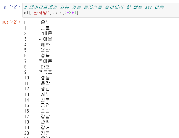 판다스 데이터프레임에서 문자열을 슬라이싱 하는 방법과 판다스의 시리즈 데이터를 리스트 형식으로 바꾸는 방법이다. 데이터프레임 안에 있는 문자열을 슬라이싱 하기 데이터프레임 안에 있는 문자열을 슬라이싱 하기 위해서는 str 을 이용하여야 한다. str 이 데이터프레임 안에 있는 문자열을 다뤄주는 함수이기 때문이다. str 을 사용한 후 슬라이싱 하는 방법은 기존 방법과 동일하다 아래가 예시이다. 시리즈 리스트 형태로 만들기 & 데이터프레임 형태로 만들기 아래의 변수 names 는 시리즈 형식이다. 시리즈 형식을 리스트로 만들기 위해서는 to_list() 를 사용하면 된다. 리스트 형식으로 데이터를 리턴해준다. 만약 시리즈 형식을 데이터프레임으로 만들고자 한다면, to_frame() 을 사용하면 된다. 아래..
