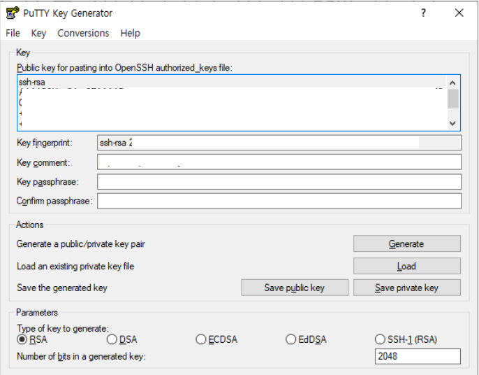 1. putty key generator 툴을 실행 시킨 후, 기존 ppk 파일을 load